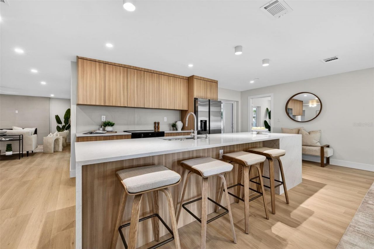 Sitting on nearly a quarter acre this 3 bed, 2 bath pool home has been recently updated with a timeless design. The kitchen has custom cabinetry and a large island with enough room for 4 bar stools. The beautiful waterfall countertops not only span the sides of the island, but overflow onto the front. Adjacent to the kitchen is the formal dining space with 3 nearly floor to ceiling windows that bring the space an ample amount of natural light. A perfectly situated breakfast nook is off of the kitchen and has views of the living space. The nook is wrapped in custom wood matching the kitchen cabinets and is the perfect space for casual dining or work from home space. The living room has plenty of space for a sectional and has an electric fireplace built out with decorative tile. The living room also has access via sliding glass doors to the screened in lanai where there is plenty of space to entertain with an outdoor eating and bar space. The home has a nice split floor plan with 2 additional bedrooms and an updated bath with double vanity on one side, and the primary suite on the other. The primary suite has large windows overlooking the backyard and pool as well as sliders that take you out to the screened in lanai. The primary suite bath has a double vanity, large walk in shower with cove lighting, and a walk in closet. Outside, the large pool was recently resurfaced and retiled and the backyard still has plenty of green space with new sod and a white vinyl fence. Additional features include hurricane impact windows, new luxury vinyl plank flooring throughout, smooth level 5 drywall finish, and located on a corner lot in a non flood zone. Located in the sought after Pinellas Point neighborhood, this home is conveniently located close to shops and restaurants all while having the luxury of the peace and quiet. Interstate access is nearby which will take you North towards Tampa or South to the Skyway Bridge and Sarasota areas. The neighborhood has plenty of tree lined streets perfect for walking, jogging, biking, or golf carting. With no HOA have the option to keep your RV or boat in the large backyard as you are minutes away from the boat ramp and Tampa Bay. The St. Petersburg Country Club is also just a short distance away and has recently underwent a massive renovation. The popular white sand beaches of the Gulf are nearby and the Tampa International Airport is less than 30 minutes away making travel and commuting easy.